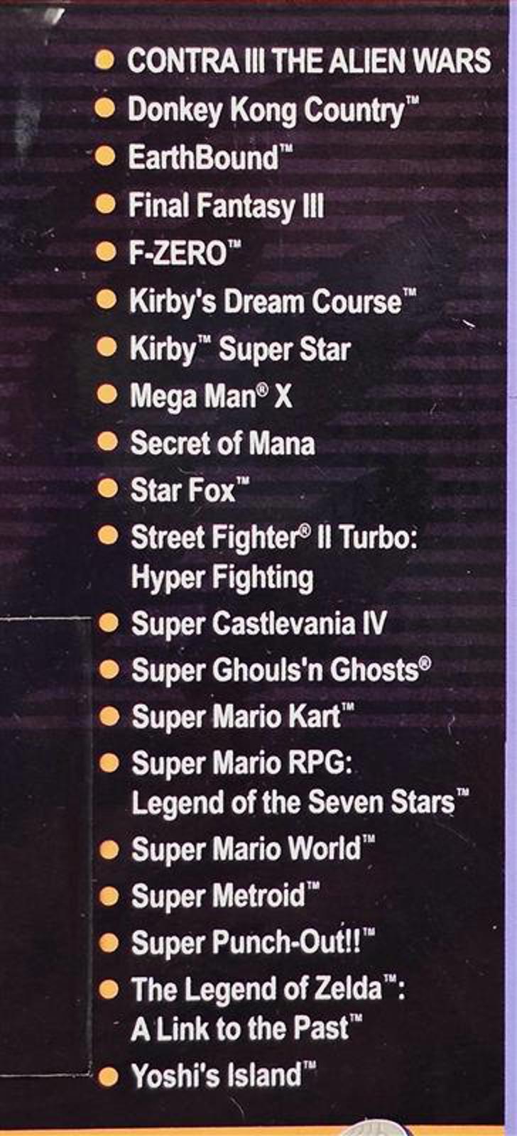 Preloaded with 21 games including Super Mario Kart, Super Metroid, Street Fighter II Turbo, Kirby Super Star, and Star Fox 2